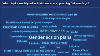 The IKI Gender Community of Practice (IKI G-CoP) is a format designed to support implementing organisations and enhance knowledge exchange and lessons learned regarding their experiences in implementing the IKI gender strategy and promoting gender justice within their projects. The IKI G-CoP is a regular and interactive event open for all IKI implementing organisations, co-hosted by the IKI Office and IKI implementers.