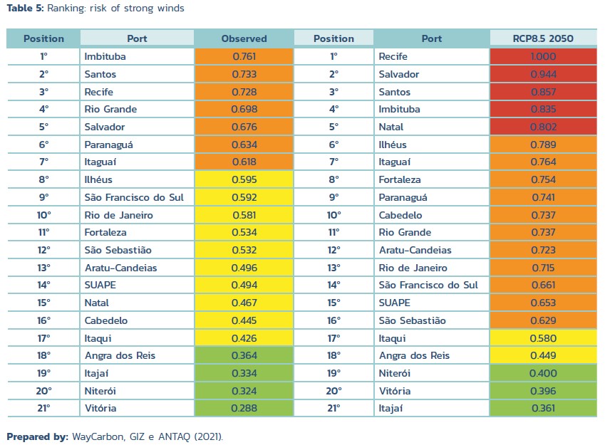After three pilot climate risk assessments in the state of Santa Catarina with the state’s main energy provider Eletrosul and Brazil’s second largest port (Itajaí), the two IKI projects were asked to support ANTAQ and MInfra in adjusting the PIEVC risk assessment method to be used for the entire port asset portfolio along Brazil’s coastline. In November 2021, ANTAQ presented the results of “Impacts and risks of climate change to Brazilian coastal public ports” showing the risks for 21 ports for 3 main climate hazards: strong winds, thunderstorms and sea level rise. One of the results of this assessment has been a risk ranking of all ports classified according to risk level, considering the present risk and projections for 2030 and 2050.