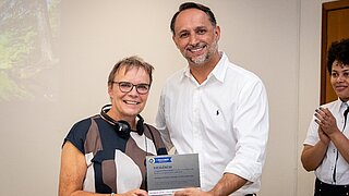 Ein Highlight ihres Besuchs war die Verleihung eines Energieeffizienz-Zertifikats an den CEO des brasilianischen Unternehmens Hausthene. Die von der Bundesregierung über die IKI geförderte Mitigation Action Facility unterstützt Industrieunternehmen wie Hausthene bei der Umsetzung von Energieeffizienz-Maßnahmen in kleineren und mittleren Unternehmen (KMU) mit dem Projekt „Transformative Investments for Industrial Energy Efficiency (PotencializEE)“. Energieeffizienzmaßnahmen tragen nicht nur zur Emissionsminderung, sondern auch zur Steigerung der Wettbewerbsfähigkeit bei. Dank der technischen Unterstützung konnte Hausthene Investitionen im Wert von über 100.000 Euro tätigen, die zu Emissionseinsparungen von 497 Tonnen CO2-Äquivalenten führen.