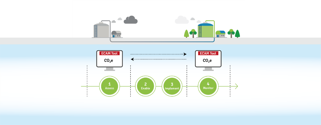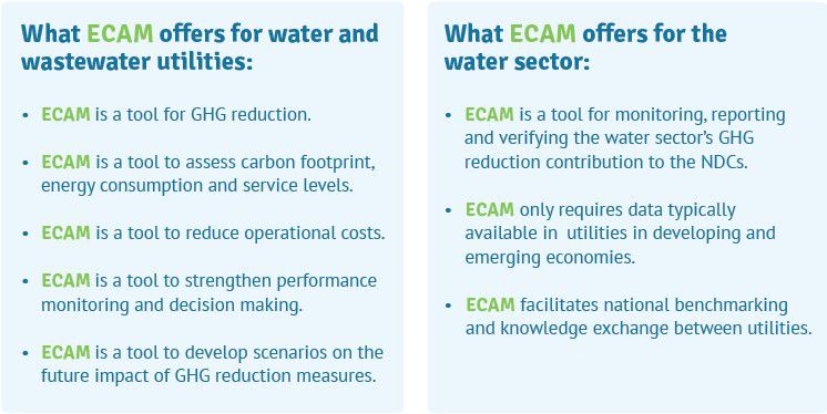 Mit ECAM können die Versorger ihren Treibhausgasausstoß und Energieverbrauch systemweit messen und gezielt verringern. Dazu bietet das Tool die Möglichkeit, verschiedene Szenarien zu entwickeln, die Auswirkungen eines verringerten Treibhausgasausstoßes zu modellieren und nach der Umsetzung von Minderungsmaßnahmen ein Ergebnis-Monitoring durchzuführen. Dadurch schaffen die Versorger die Voraussetzungen, um künftige Anforderungen an Klimaschutzberichte erfüllen zu können. Darüber hinaus unterstützt ECAM auch auf nationaler Ebene die Verknüpfung von Monitoring, Reporting & Verification (MRV) in Bezug auf Minderungsmaßnahmen im Wassersektor.