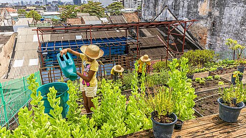 - Hans von Manteuffel aus Brasilien, der einen Einblick gewährt, wie ein Dach in einen Gemüsegarten verwandelt wurde, in dem junge Menschen aus der Gemeinschaft Bio-Lebensmittel für 400 Familien in der Nachbarschaft anbauen.