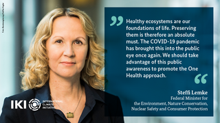 “Eine gesunde Umwelt ist Voraussetzung für unsere menschliche Gesundheit, für unser Wohlbefinden und eine resiliente Wirtschaft und Gesellschaft. Gesunde Ökosysteme sind unsere Lebensgrundlage. Die Corona-Pandemie hat uns deutlich vor Augen geführt, wie eng die Gesundheit von Menschen, mit der von Tieren und Ökosystemen zusammenhängt. Diese Aufmerksamkeit sollten wir jetzt für den One Health-Ansatz nutzen. Um das Risiko zukünftiger Zoonosen und Pandemien zu verringern, brauchen wir eine ambitionierte Arten- und Naturschutzpolitik.“