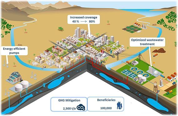 Glücklicherweise gibt es zahlreiche vielversprechende Lösungen, um den Wassersektor klimafreundlicher zu gestalten und so einen Beitrag zum Klimaschutz zu leisten. Das Vorhaben Wasser- und Abwasserunternehmen auf dem Weg zur CO2-Neutralität (WaCCliM) sowie beteiligte Wasser- und Sanitärversorger aus vier Ländern (Jordanien, Mexiko, Peru und Thailand) zeigen, wie der Wassersektor seinen Treibhausgasausstoß erheblich verringern kann. So ist es durch die Verbesserung von Betriebsprozessen und die Steigerung der Energieeffizienz bereits kurzfristig möglich, den Energieverbrauch um bis zu 40 Prozent zu senken. Langfristig sollen Wasser- und Abwassersysteme so modernisiert und umgebaut werden, dass die Versorger klimaneutral operieren.