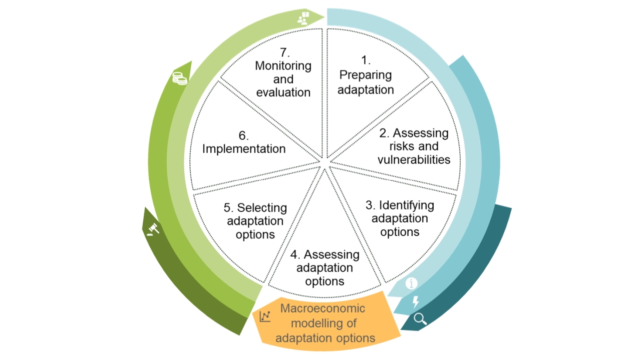 Anschließend werden Anpassungsmaßnahmen für die makroökonomische Modellierung identifiziert – das können konkrete Investitionen in klimaresiliente Straßen, Tröpfchenbewässerung in der Landwirtschaft, Schutz vor Starkwinden durch Hecken und vieles mehr sein. Da die Analyse sehr datenintensiv ist, sollten hierfür nur die relevantesten Maßnahmen ausgewählt werden.
