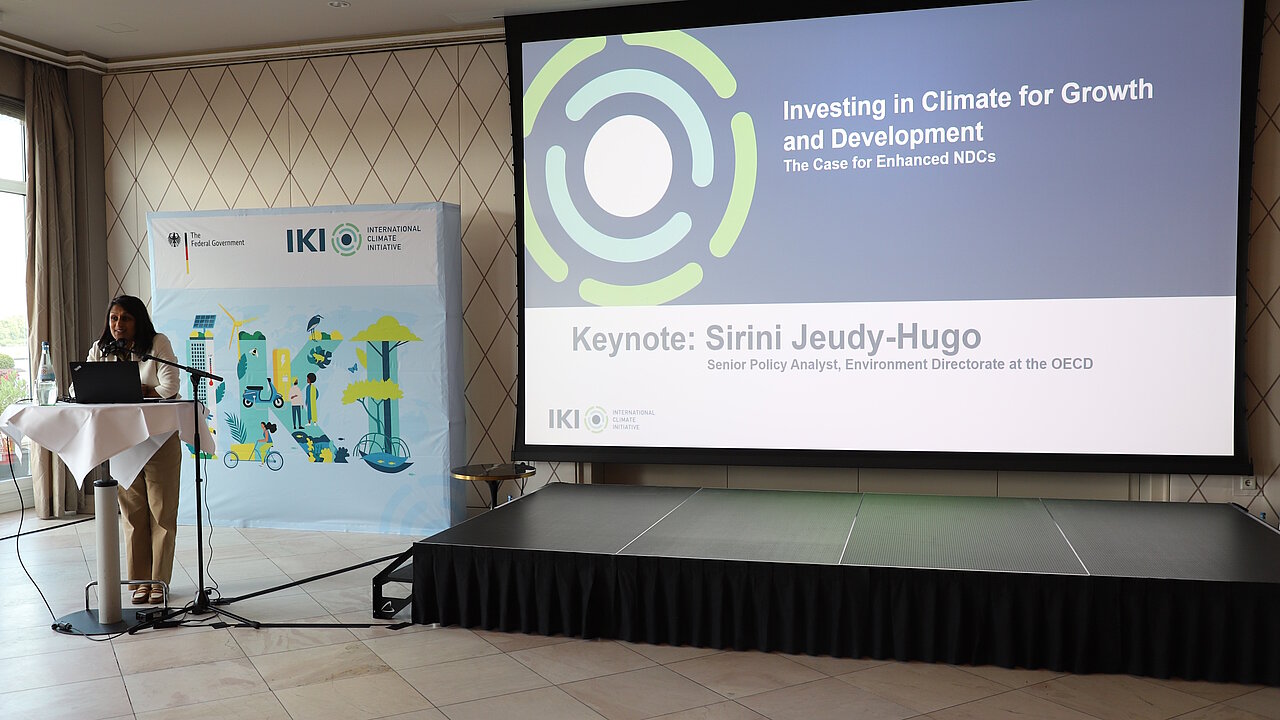 Als Keynote‑Rednerin präsentierte Sirini Jeudy‑Hugo von der Organisation für wirtschaftliche Zusammenarbeit und Entwicklung (Organisation for Economic Co-operation and Development, OECD) den von der IKI mitfinanzierten Bericht „Investing in Climate for Growth and Development“. Sie zeigte, dass ambitionierte NDCs nicht nur den Klimaschutz stärken, sondern auch das Wirtschaftswachstum beschleunigen. Rund 140 Teilnehmende aus der IKI‑Community nutzten am Abend die Gelegenheit, um sich zu vernetzen und Erfahrungen auszutauschen.