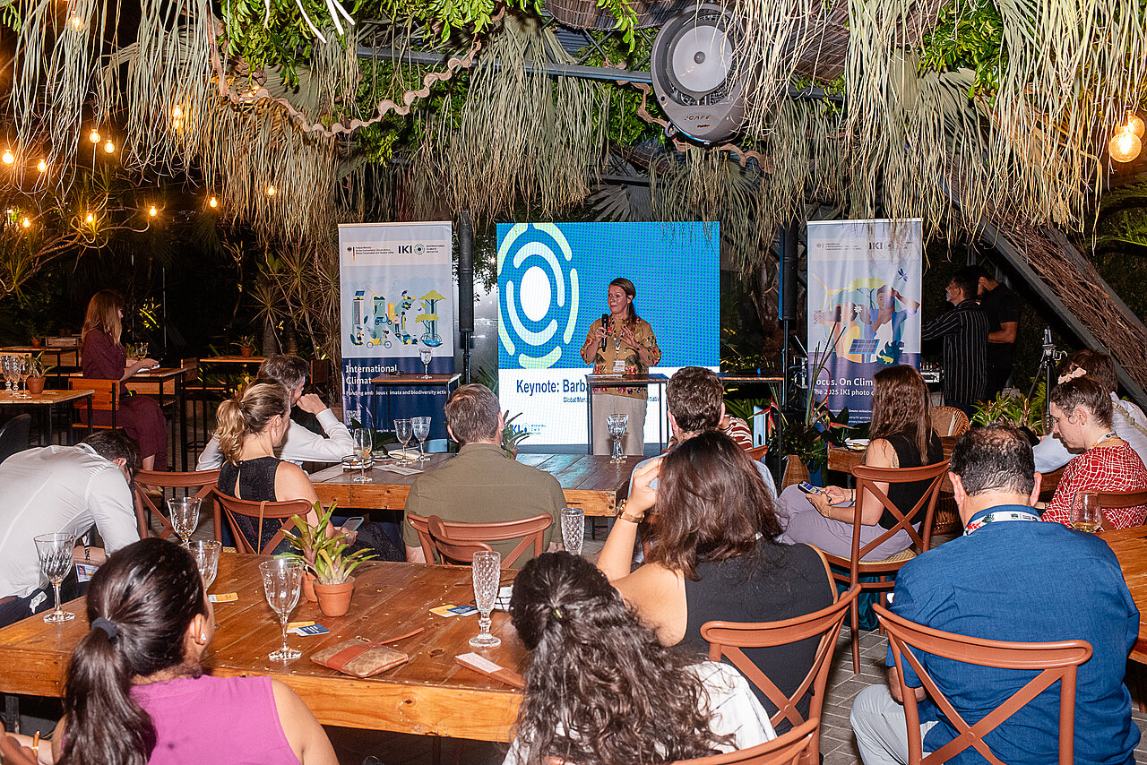 Barbara Buchner, Global Managing Director der Climate Policy Initiative, lieferte in ihrem Vortrag spannende Impulse zum Thema „Innovative Klimafinanzierung“ und regte weitere Diskussionen an. Ein weiterer Höhepunkt war die Vorstellung der zehn besten Beiträge des IKI-Fotowettbewerbs 2025. Die eindrucksvollen Bilder dienten gleichzeitig als kreative Orientierungspunkte für den anschließenden Networking-Teil – von Biodiversität über Klimafinanzierung bis zu nachhaltiger Landnutzung.