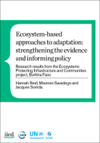 Dieser Bericht präsentiert die Ergebnisse einer Literaturrecherche sowie von Interviews mit einer Vielzahl von Stakeholdern, die IUCN am Standort des Projekts "Ökosystembasierte Ansätze zur Klimaanpassung: Stärkung der Evidenz und der Informationsgrundlage für politische Entscheidungen" im nördlichen Burkina Faso durchführte. Die dortigen Projektativitäten umfassen Bodenschutz- und Wiederherstellungsaktivitäten, Wassererhaltungsmaßnahmen, Wiederaufforstung und von Landwirten organisierte natürliche Regeneration, Schutz von Flussufern und Staudämmen sowie Nutzung von Biokompostoren und biologischem Gartenbau.